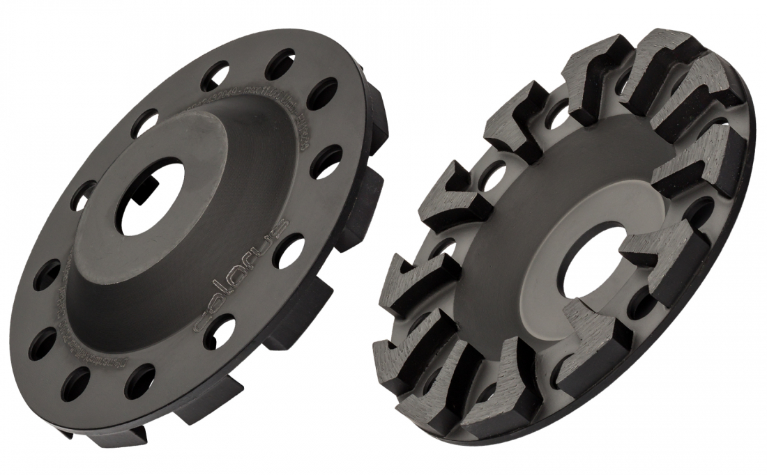 • Diamantschleifteller für Betonschleifer in PREMIUM Qualität - Zum Abschleifen von dünn beschichteten Betonteilen, Anschleifen von verwittertem Altbeton, hartem Zementputz, Entfernen von Schalungsnasen, Epoxidharzbeschichtungen, Beton Sinterschichten etc.